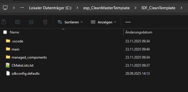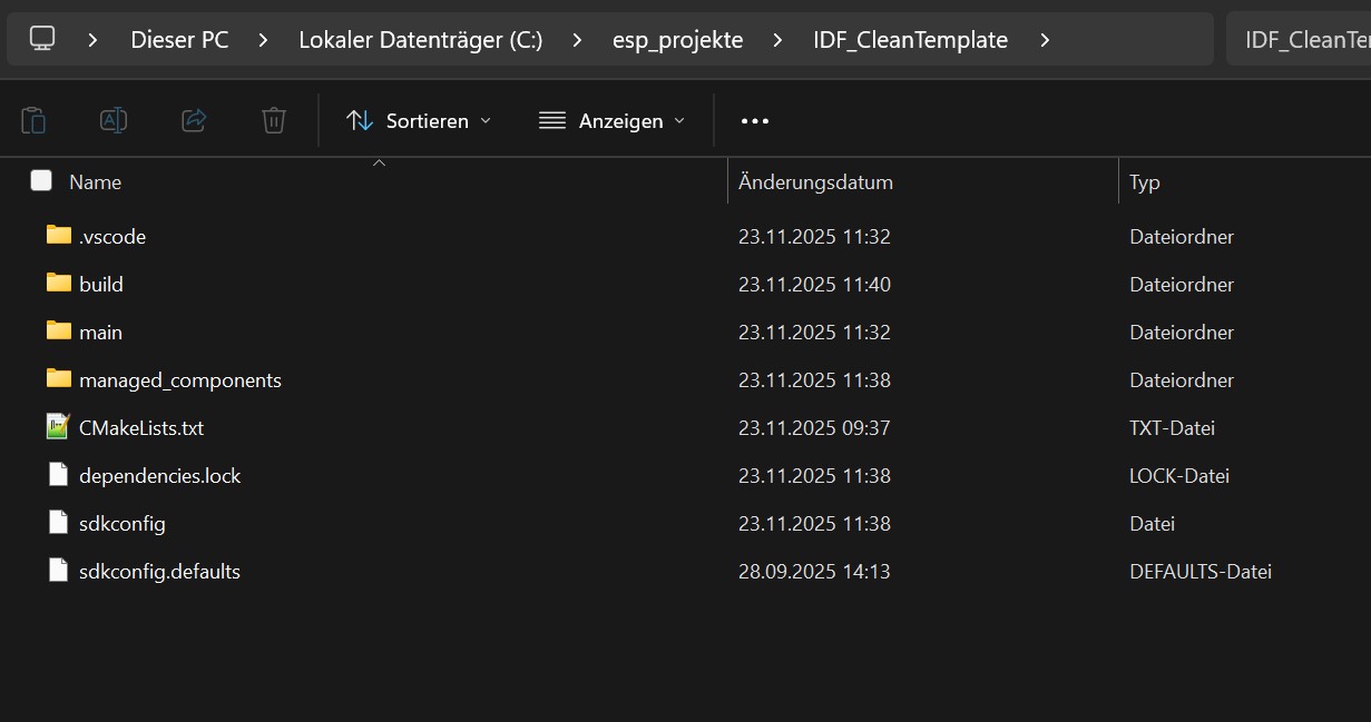 Für ein neues Projekt nehmen wir jetzt unseren IDF_CleanTemplate-Ordner und kopieren ihn vollständig an einen Ort, an dem wir unsere neuen Projekte erstellen möchten. In meinem Fall in C:\esp_projekte. Jetzt können wir den Ordner nach Belieben umbennen und einen passenden Projektnamen wählen.