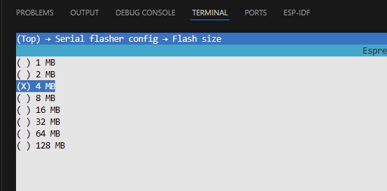 Eine weitere Einstellung die wir schon einmal anpassen können ist die Flash Größe. Diese ist default auf 2 MB eingestellt, aber die meisten ESP32 Boards haben einen 4 MB Flash. Einfach unter Serial flasher config -> Flash size (2 MB) auf 4 MB einstellen.