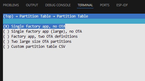 Vieles ist schon vorkonfiguriert und das meiste kann man auch so lassen. Einiges werden wir im Verlauf aber ändern, wie z.B. das Partition Table. Default ist es auf Single factory app, not OTA eingestellt, was bedeutet, dass es nur eine Firmware Partition gibt und die App genau einmal im Flash liegt. Kein OTA bedeutet, dass es keine Over-The-Air-Update Möglichkeit gibt, Firmware also nur über USB oder JTAG aktualisiert werden kann.