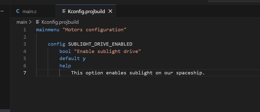 Als kleines Beispiel können wir das Beispiel aus Kconfig and Kconfig.projbuild Files verwenden und in die Datei Kconfig.projbuild kopieren (Abb. 7).