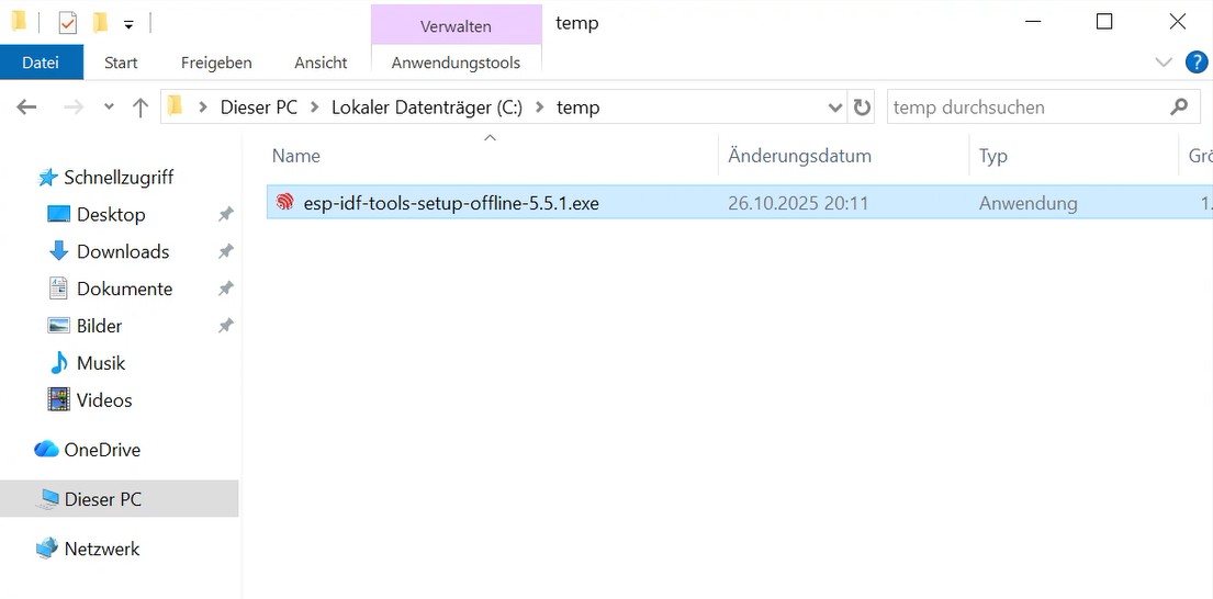 Hinweis: Das ESP-IDF unterstützt keine Leerzeichen in Pfaden zu ESP-IDF oder zu Projekten. Das führt zu schwer lokalisierbaren Fehlern. Pfade, wie z.B. C: \Users\Max Mustermann\Documents ist nicht erlaubt, wegen dem Leerzeichen zwischen Name und Nachname. In diesem Fall ist die Installation unter C:\ zu empfehlen, so wie es hier im Beispiel auch erfolgt.