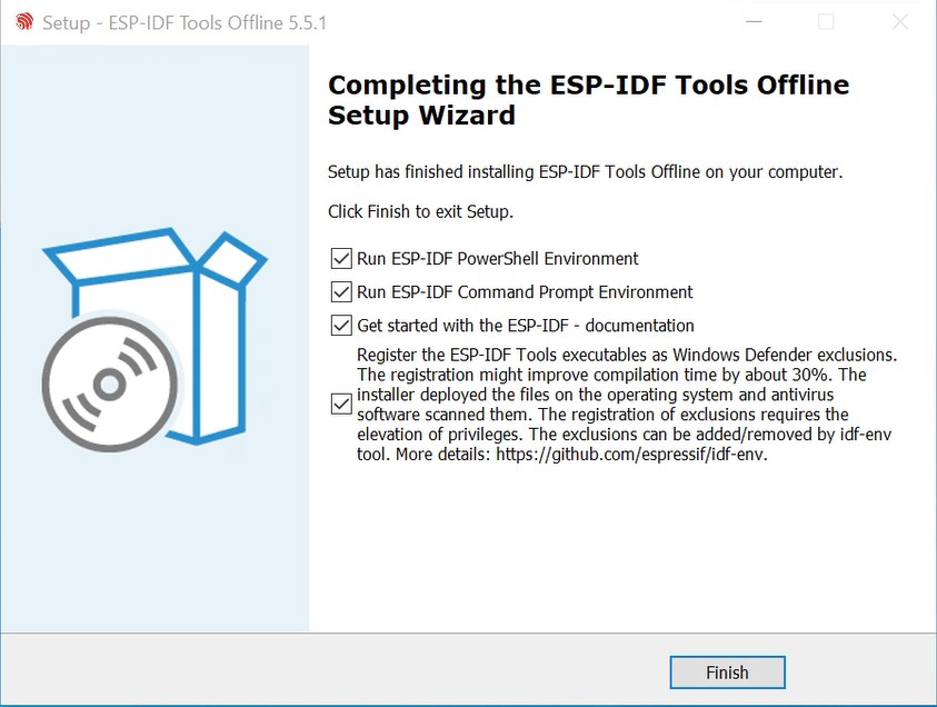 Vor Abschluss der Installation erscheint noch das Setup Wizard, in dem alle Häkchen schon gesetzt sind. Das soll uns nicht weiter stören. Einfach Finish klicken und es öffnen sich die angehakten Fenster. Uns interessiert hier aber nur die ESP-IDF CMD oder die PowerShell, je nach Geschmack. Ich verwenden die CMD.