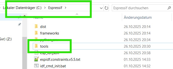 Wichtige Ordner für die weiteren Schritte, sind der tools-Ordner unter C:\Espressif\ und der esp-idf Ordner unter C:\Espressif\frameworks\. Auf diese Ordner werden wir später bei der Integration von ESP-IDF in VS Code wieder zurück kommen.