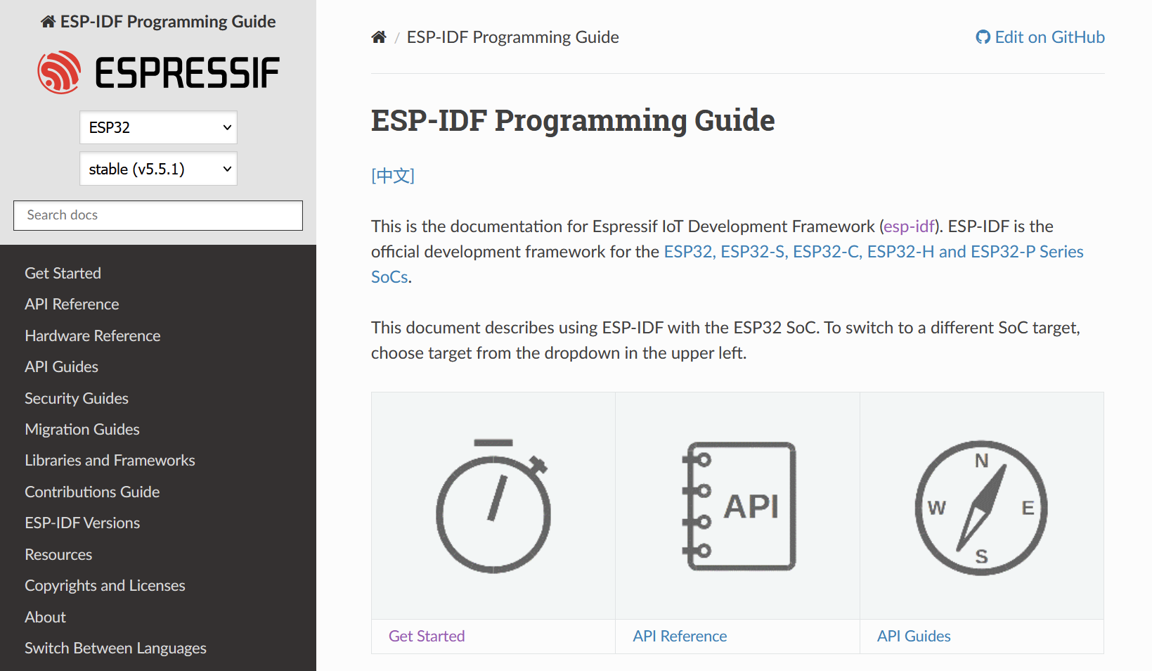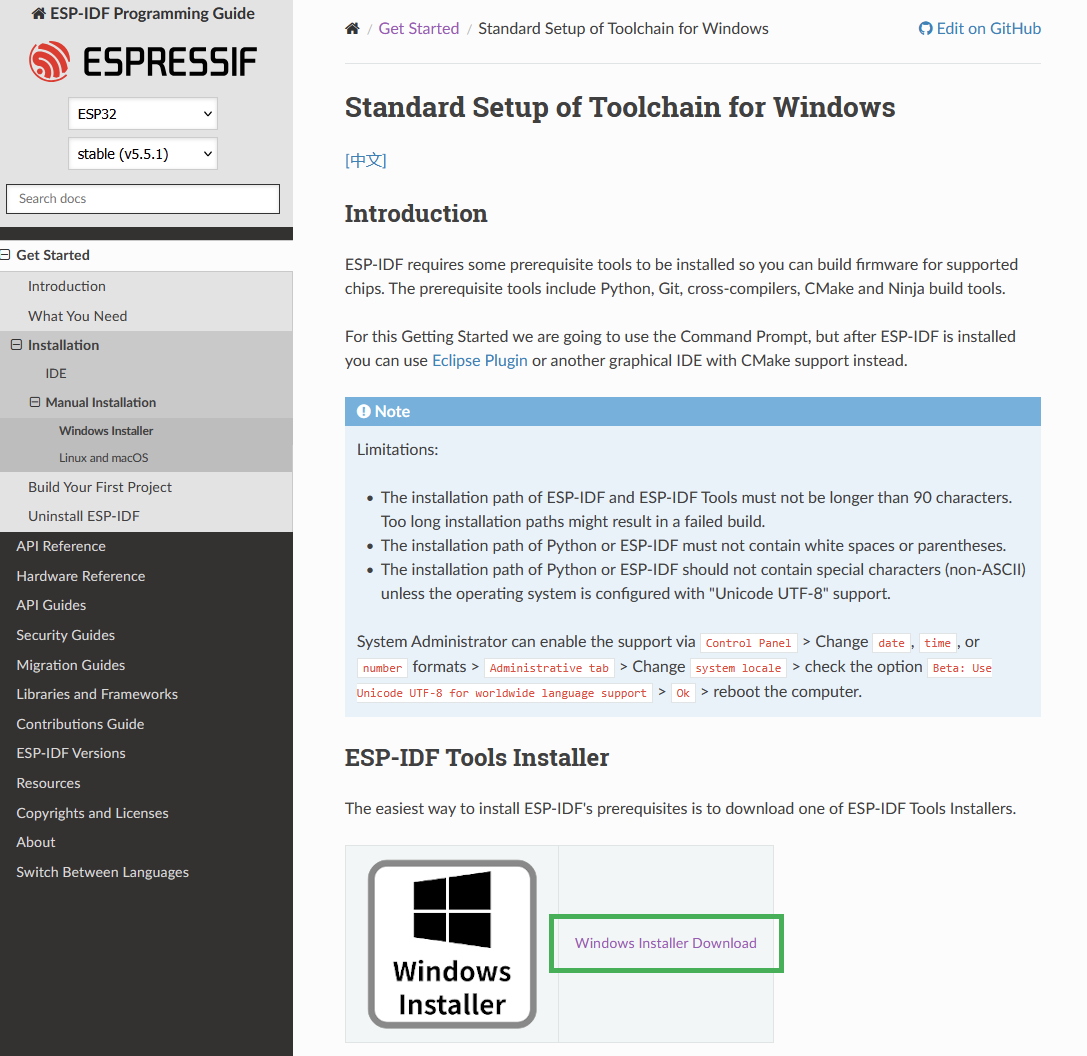 Am einfachsten kommt man an den ESP-IDF Windows Installer über das ESP-IDF Programming Guide. Den gewünschte Microcontroller auswählen – in unserem Fall ESP32 – und auf Get Startetd klicken.