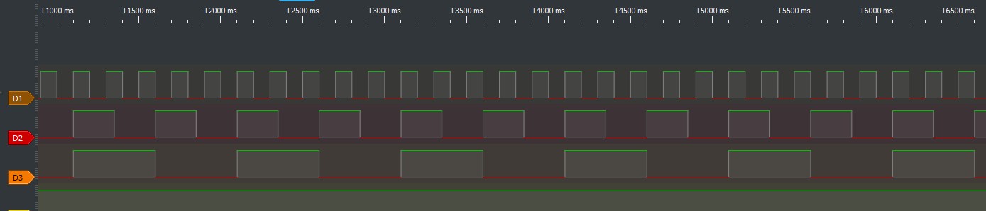In diesem Beispiel verwenden wir pro LED eine eigene Task. In Abb. 3 können wir erkennen, dass die LEDs tatsächlich gleichzeit gestartet werden. Alle LEDs blinken im Sekundentakt. Dieses gleichmäßige Verhalten liegt daran, dass die Tasks zur gleichen Zeit gestartet wurden und alle mit den gleichen Parametern ausgestattet sind.
