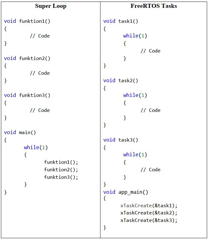 Bei der Task-Variante sieht das schon ganz anders aus. Im Gegensatz zur Superloop, wird hier die main verlassen! Die drei Tasks werden einmalig nach einander aufgerufen und damit endet die main. FreeRTOS übernimmt jetzt. Die Tasks selbst haben jetzt eigene Endlosschleifen und dürfen nie verlassen werden! Die Tasks selbst laufen aber quasi-parallel ab. D.h. ganz einfach ausgedrückt, dass man eine Task wie ein eigenes Programm behandeln kann welches vollkommen unabhängig von der anderen Task arbeitet. Keine Task muss darauf warten das eine andere Task beendet wird, sie laufen vollkommen unabhängig von einander!