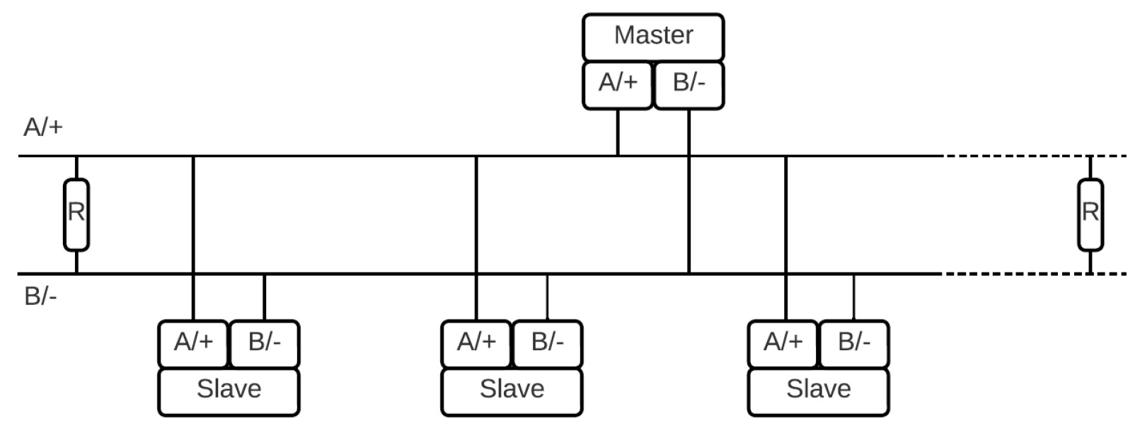 Die Kommunikation über EIA-485 erfolgt symmetrisch7 und kann im Halb- oder Vollduplex Betrieb erfolgen. Bei Vollduplex werden statt zwei Leitungen vier Leitungen benötigt. Für eine fehlerfreie Kommunikation müssen alle Teilnehmer im Netzwerk die gleichen Einstellungen haben, wie die Zahl der Datenbits, der Paritäts- und Stoppbits und der Baudrate (üblich 9600 – 19200 Bits/s).