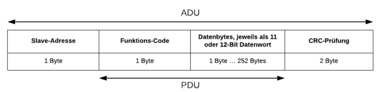 Der gesamte Rahmen (Application Data Unit, ADU) des Protokolls Modbus RTU, besteht aus den Feldern Slave Adresse, Funktionscode, Datenbytes und CRC Prüfung. Dabei nennt man den Teil ohne Slave ID und ohne CRC-Prüfung Protocol Data Unit (PDU). Die PDU beinhaltet mit dem Funktionscode und den Datenbytes, bei allen Modbus Varianten (RTU/ASCII/TCP) den gleichen Informationsgehalt.