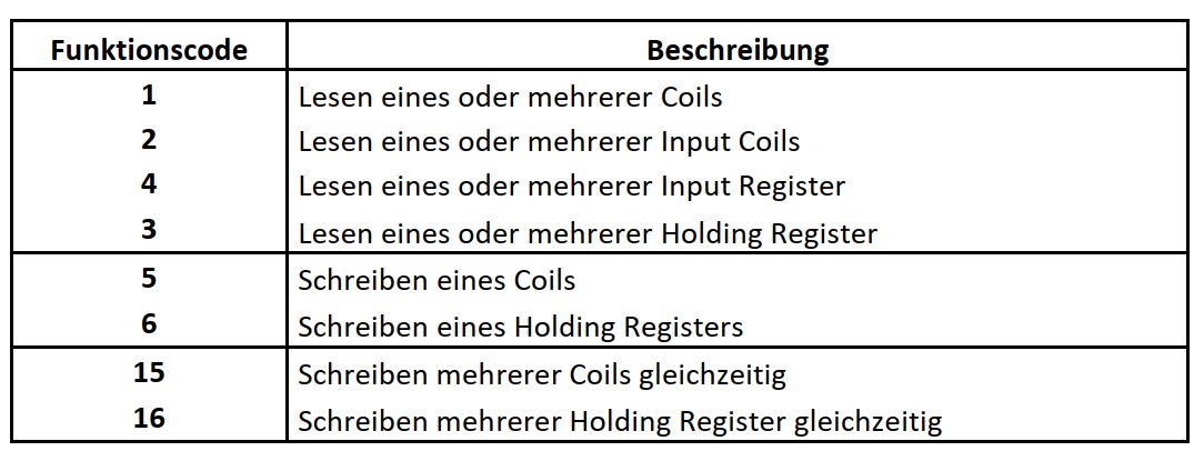 In einem Netzwerk wird jedem Slave eine eigene 1-Byte Adresse von 1…247 zugeordnet, wobei der Master keine eigene Adresse hat. Mit der Adresse 0, kann der Master durch einen Rundruf (Broadcast) alle Slaves gleichzeitig ansprechen. Die Adressen 248 – 255 sind reserviert. Der Funktionscode vermittelt den Slaves die durchzuführende Aktion. Die häufigsten Codes sind in folgender Tabelle aufgeführt.
