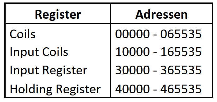 Die Adressen der Register werden mit zwei Bytes codiert und können somit jeweils bis zu 65535 Coils, Input Coils, Input Register und Holding Register adressieren.